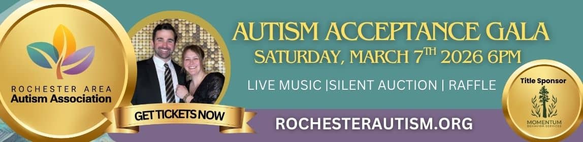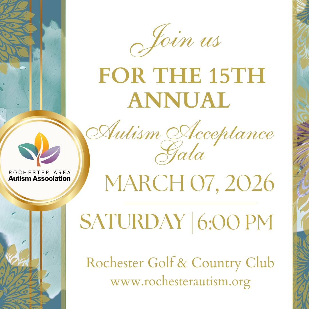 Dear Friend of the Rochester Area Autism Association, We’re excited to share that tickets for the 2026 Autism Acceptance Gala are now officially on sale! This year is a special celebration of the incredible growth of our autism community and the meaningful impact your support helps make possible for individuals and families. Join us for a fun and inspiring evening filled with connection, hope, and purpose: all in support of programs that provide education, resources, and hope to those...